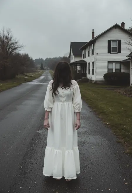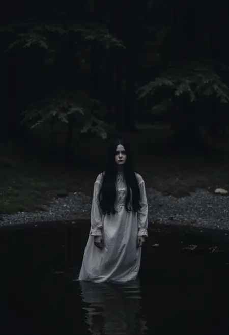 허물어진 흰 드레스를 입고, 물속에 흩어지는 잉크처럼 흐르는 긴 검은 머리카락을 지닌 그녀는 잊혀진 장소—깊고 고대의 숲과 버려진 거리—를 유랑하며, 잃어버린 것을 영원히 찾고 있다.