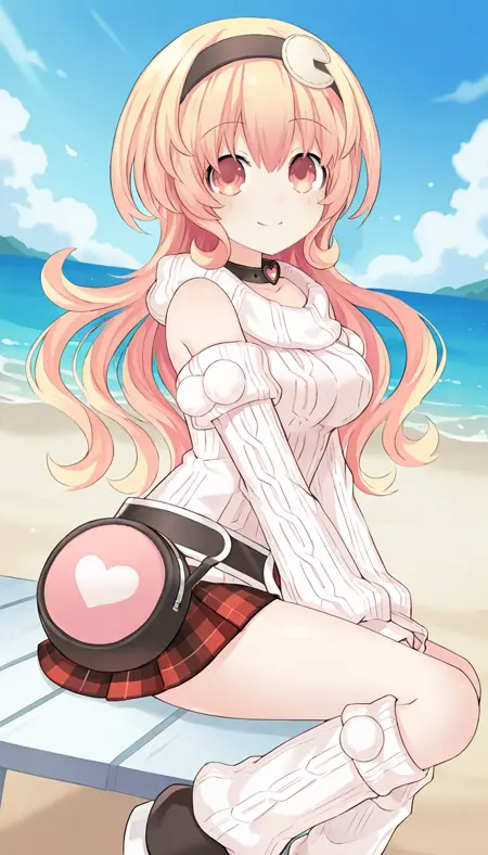 服装: 发带,心形项圈,脱袖,露肩,针织毛衣,袖子超过手腕,格子裙,迷你裙,腿套,靴子,腰带