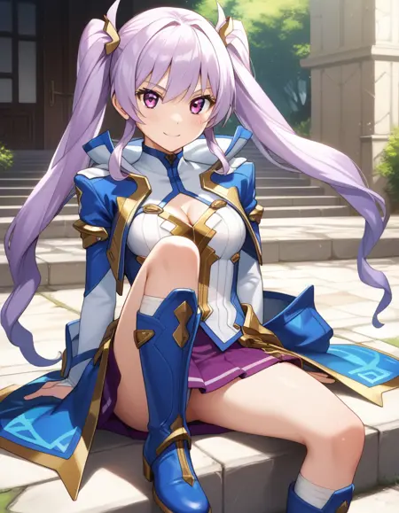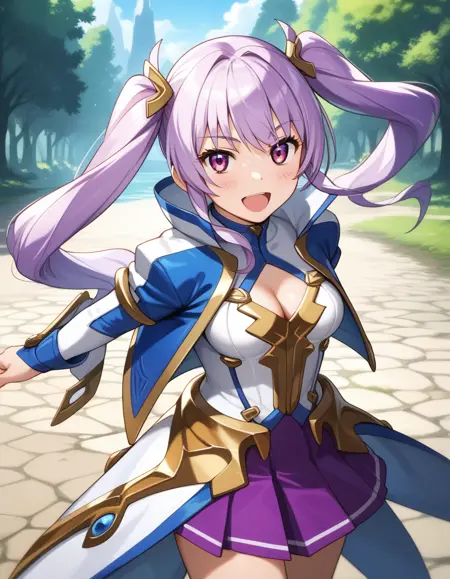 elfriede_albert(witchmaster), purple eyes, twintails, long hair, purple hair, medium breasts,