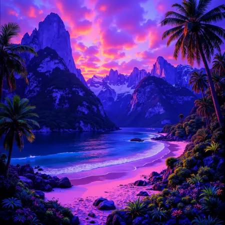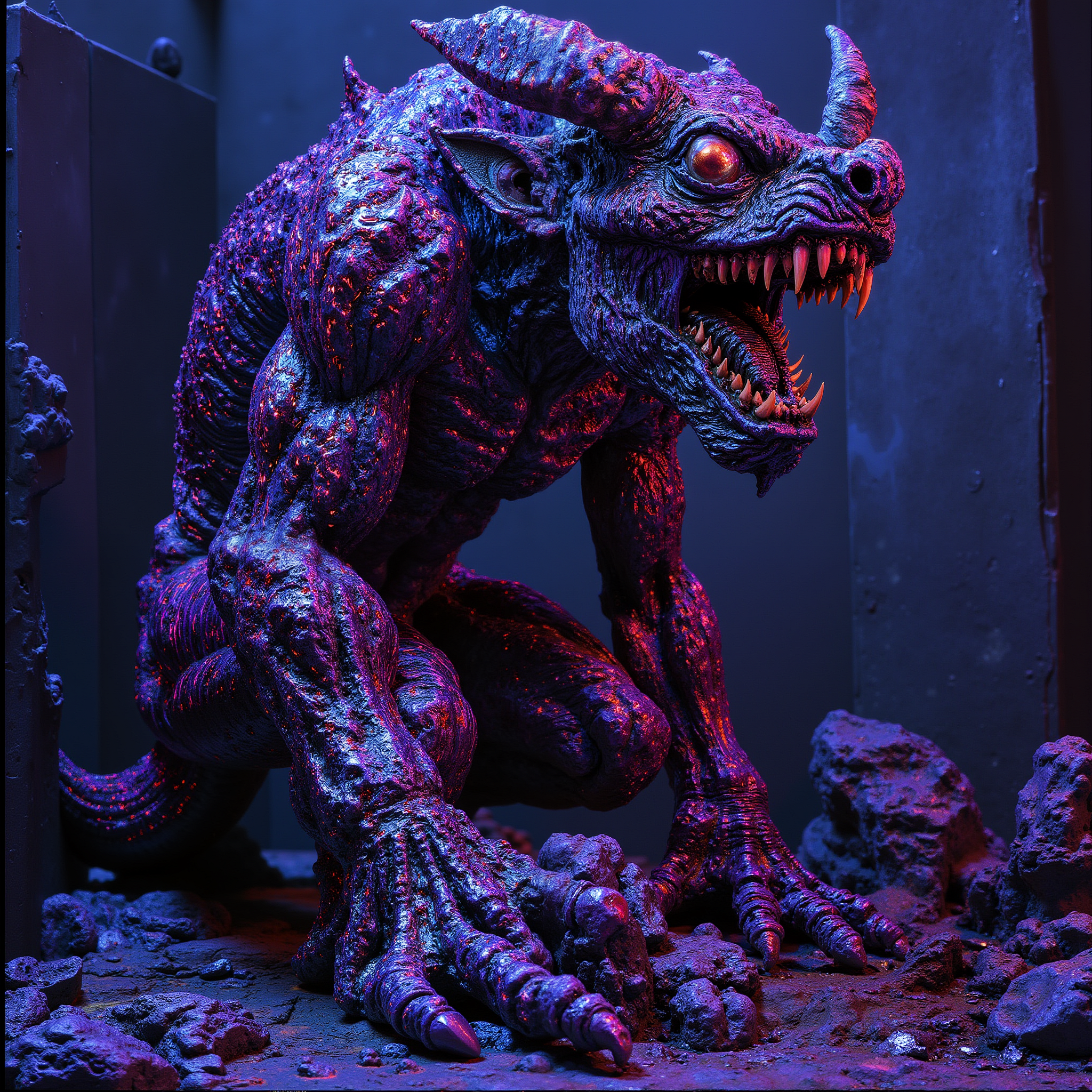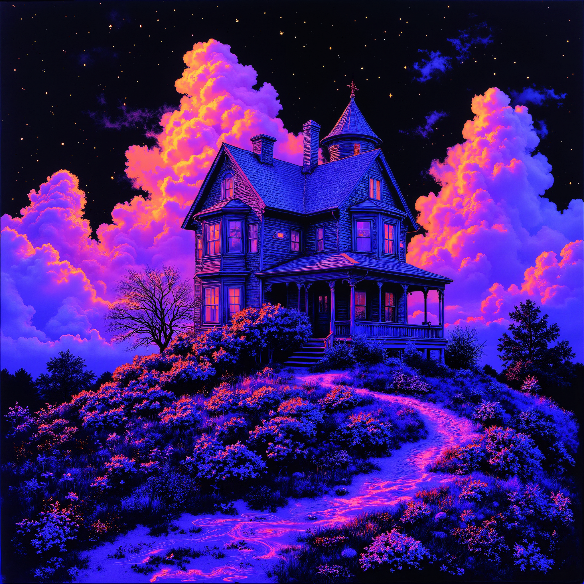 FLUX開発モデルに学習させたLoRAで、ネオン・UV照明された画像を生成します。