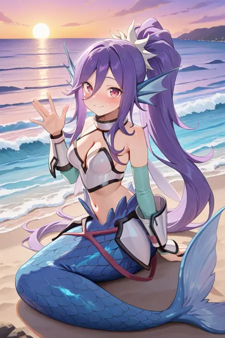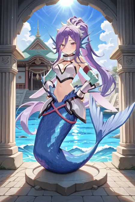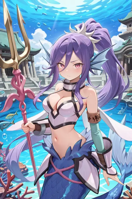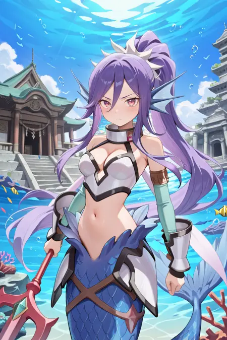 役立つタグ: 1girl, マーメイド, 膝のないマーメイド, 赤い目, 長髪, ポニーテール, 紫の髪, 頭のヒレ, ヒレ, 青いウロコ, 翼, 白いカラー, アーマー, アームガード, 胸元, 胸元の切り替え, へそ,
