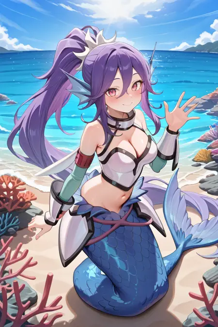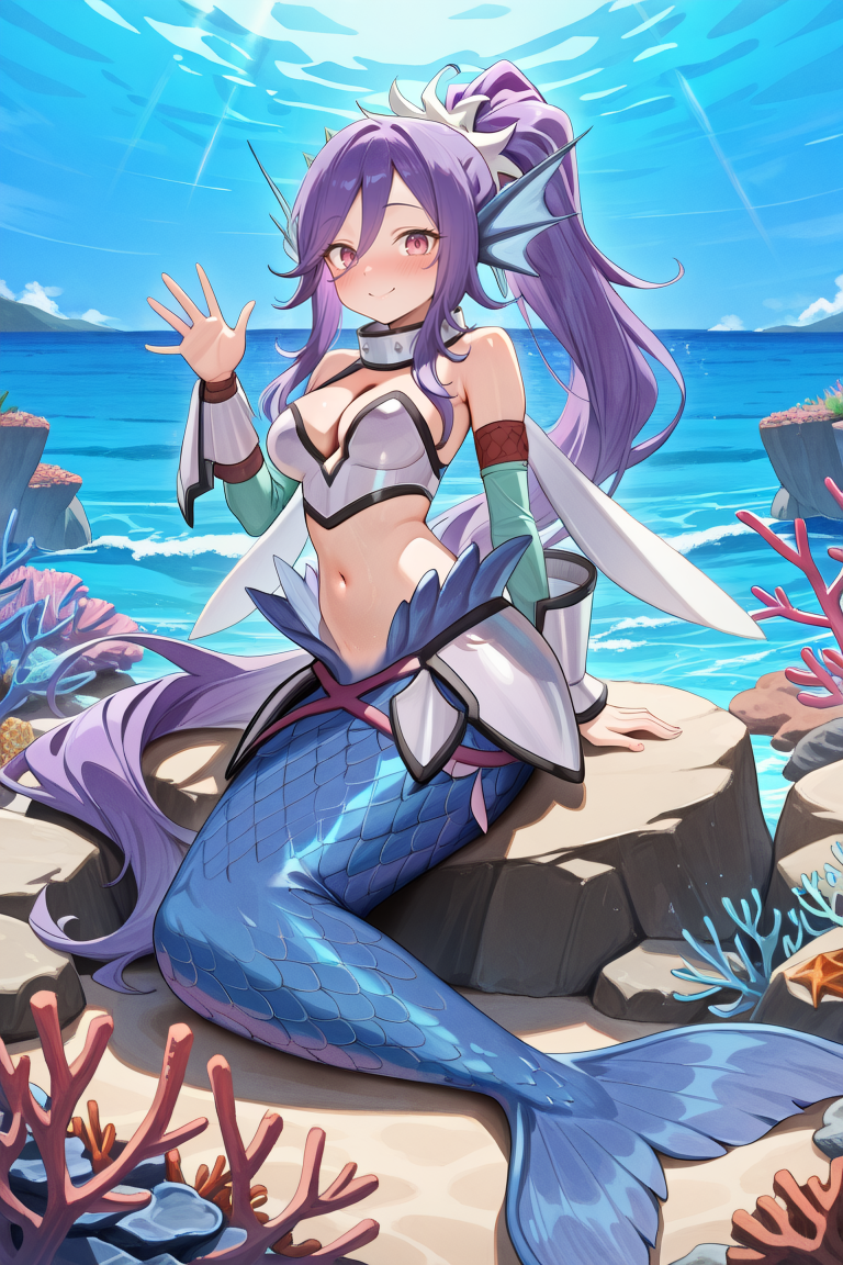 役立つタグ: 1girl, マーメイド, マーメイドの尾, モンスターガール, ピンクの目, 長髪, 非常に長い髪, ポニーテール, 高いポニーテール, 紫の髪, 頭のヒレ, ヒレ, 青いウロコ, 翼, スパイク付き髪飾り, 白い髪飾り, 白いカラー, アーマー, 茶色い腕帯, バンブレイス, アームガード, 胸元, 胸元の切り替え, 肩の露出, オーシャンブルーの袖, 取り外し可能な袖