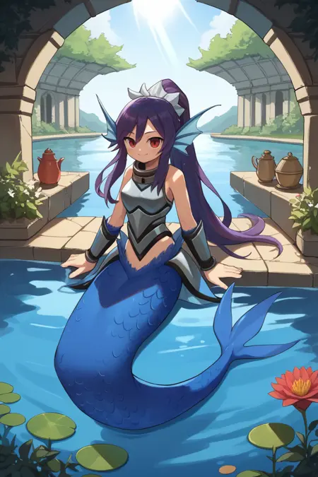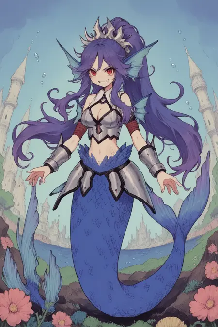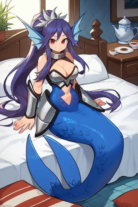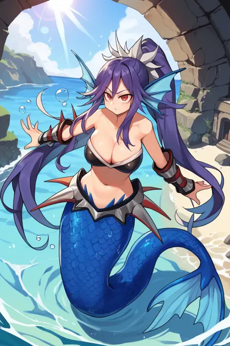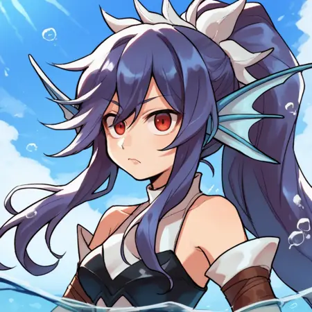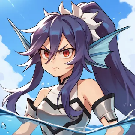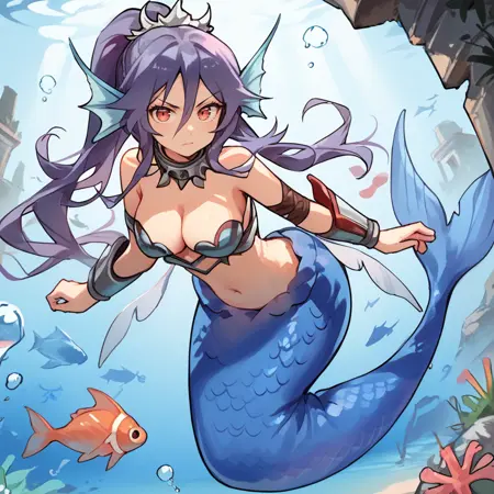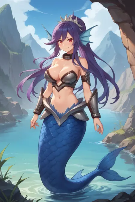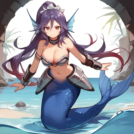Helpful Tags: 1girl, mermaid, kneeless mermaid, red eyes, long hair, ponytail, purple hair, head fins, fins, blue scales, wings, white collar, armor, arm guards, cleavage, cleavage cutout, navel,