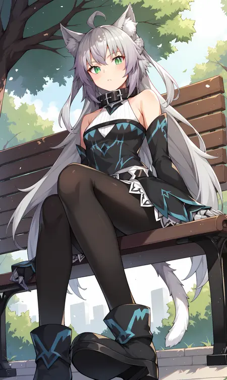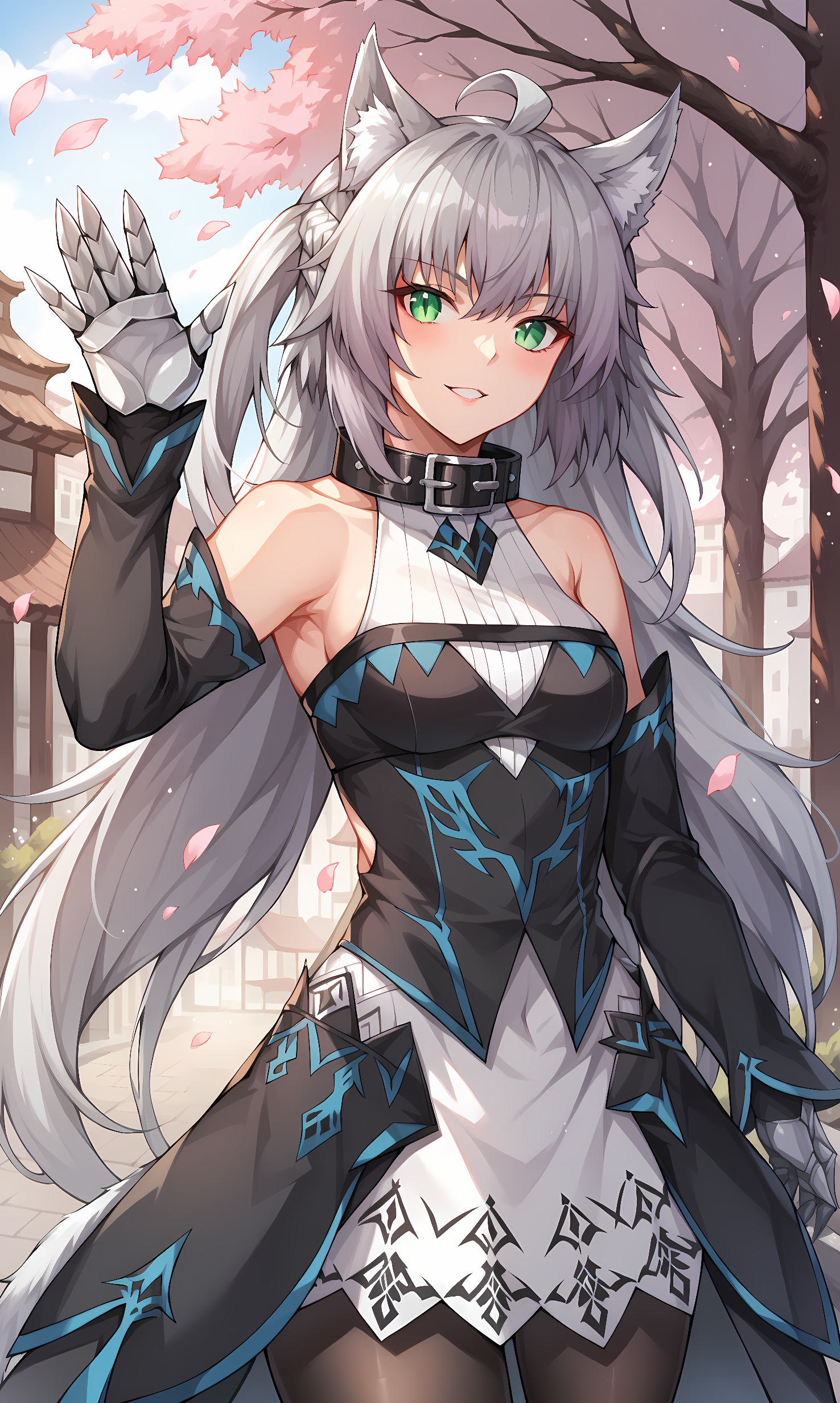 阿塔兰忒,绿色眼睛,竖瞳,灰发,长发,呆毛,动物耳朵,猫耳,猫尾