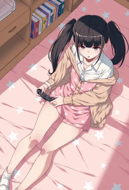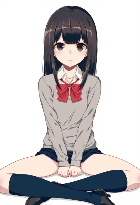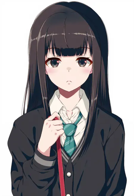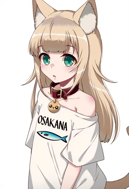 고양이 소녀의 표준 복장 유도 예시: 그녀는 커다랗고 생동감 있는 티올색 눈과 어깨를 따라 흘러내리는 길고 곧은 연한 갈색 머리카락을 가지고 있다. 그녀의 머리에는 두 개의 큰 고양이 귀와 고양이 꼬리가 장식되어 있어 고양이처럼 변형되었음을 나타낸다. 그녀는 흰색 어깨 드러난 티셔츠를 입고 있으며, 그 위에는 "OSAKANA"라는 단어와 물고기 그림이 인쇄되어 있다. 그녀의 목에는 빨간 목걸이가 둘러져 있고, 그 안에는 원형 펜던트가 달려 있으며, 이 펜던트에는 작은 고양이 얼굴 디자인이 있어 고양이 테마를 강조한다.