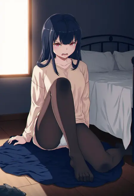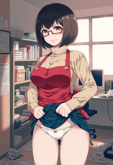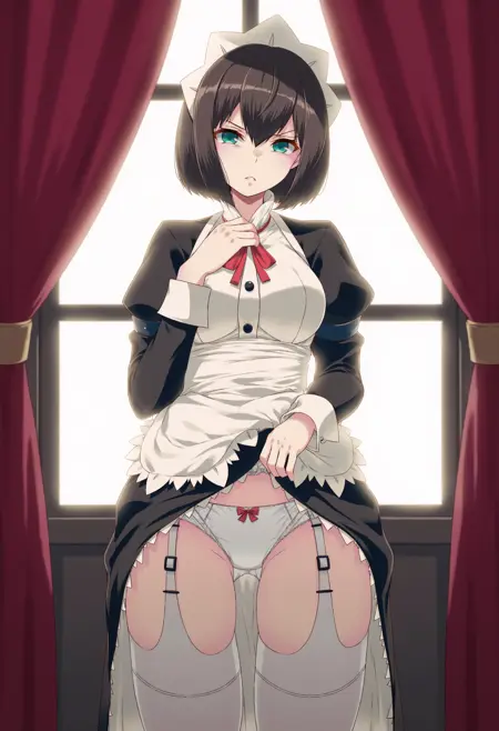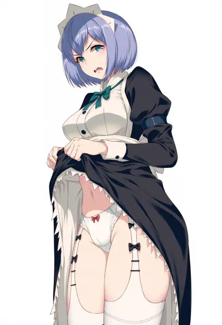 메이드 유도 예시: 이 이미지는 메이드 복장을 입은 젊은 여성을 디지털 애니메이션 스타일로 그린 일러스트레이션이다. 인물은 피부가 하얀 여자로, 단발머리의 검은 머리를 가지고 있으며, 얼굴을 감싸는 보브 컷으로 스타일링되어 있다. 그녀는 커다랗고 생동감 있는 티올색 눈을 가지고 있고, 표정은 중립적이다. 그녀는 전통적인 프랑스 메이드 복장을 입고 있으며, 흰색 앞치마에 검은 테두리가 있고, 흰색 팔뚝이 부풀어 오른 검은 상의, 그리고 작은 흰색 메이드 모자로 구성되어 있다. 메이드 복장은 흰색 스타킹과 흰색 가터벨트에 부착된 가터 스트랩, 그리고 일치하는 흰색 팬티로 완성된다. 그녀는 팬티를 드러내기 위해 드레스를 들어올리고 있다.