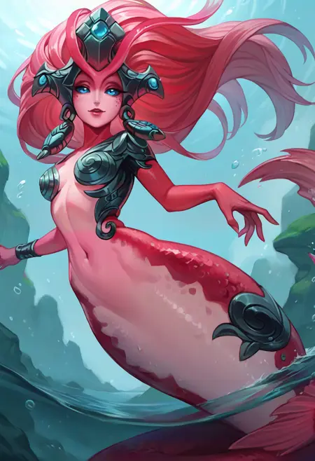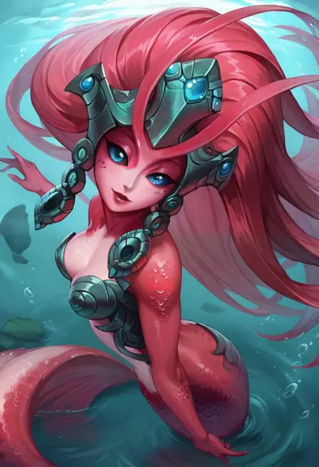 n4mik0i, 1girl, monster girl, mermaid, blue eyes, colored sclera, colored skin, red skin, pink skin, long hair, red hair