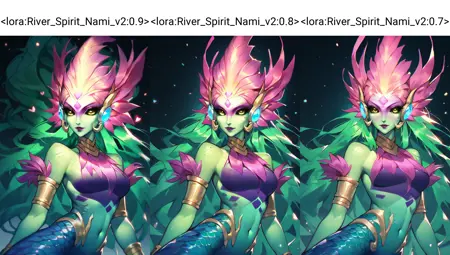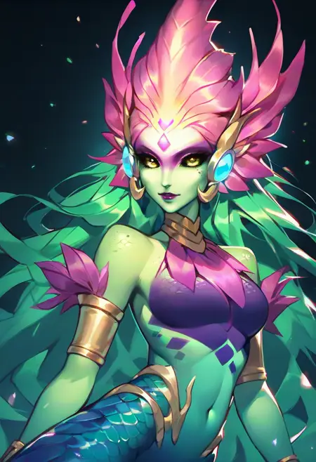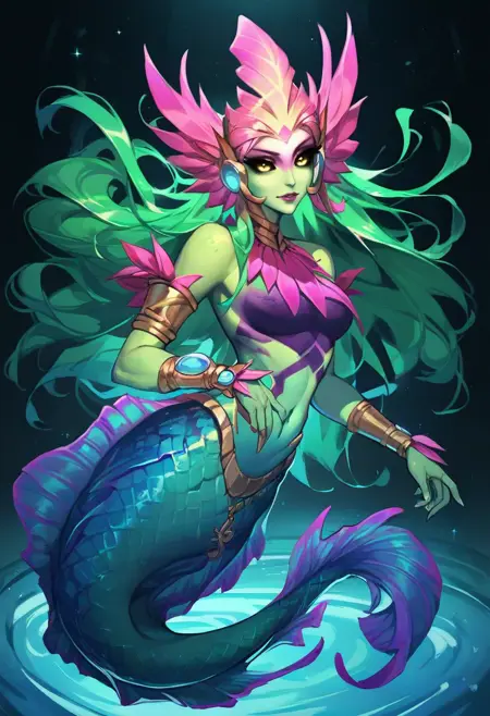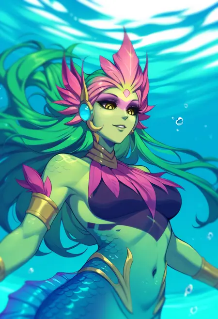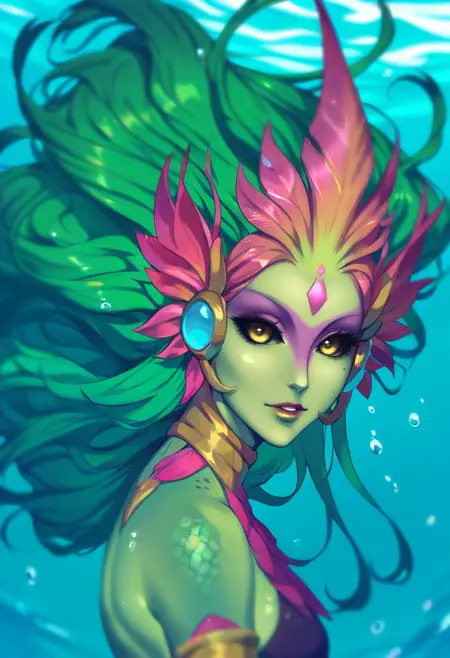riv3rspiritn4mi, 1girl, monster girl, mermaid, green skin, colored skin, yellow eyes, long hair, green hair,