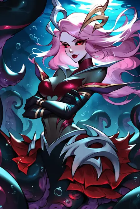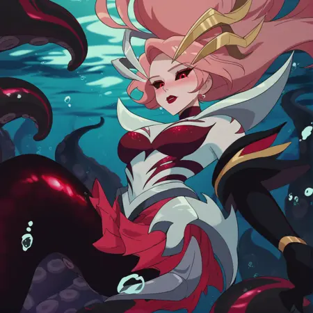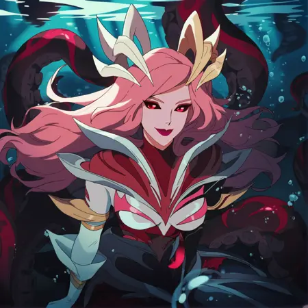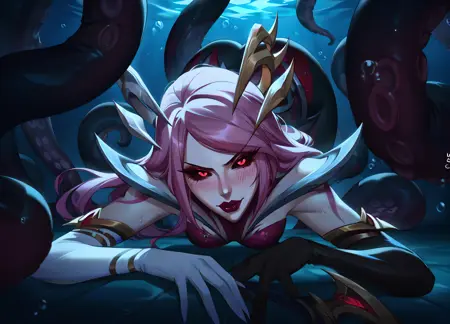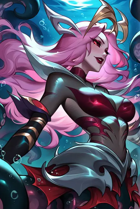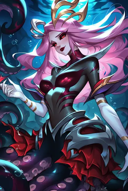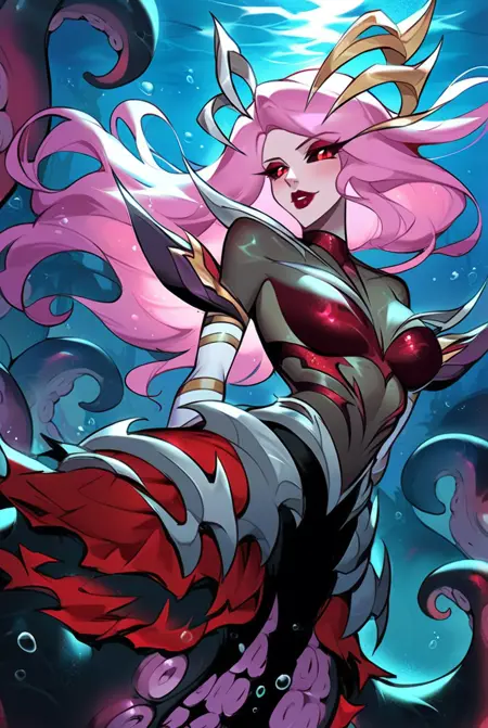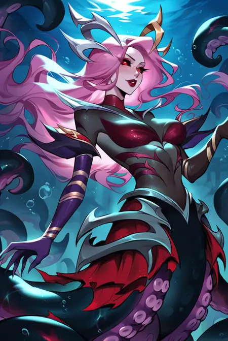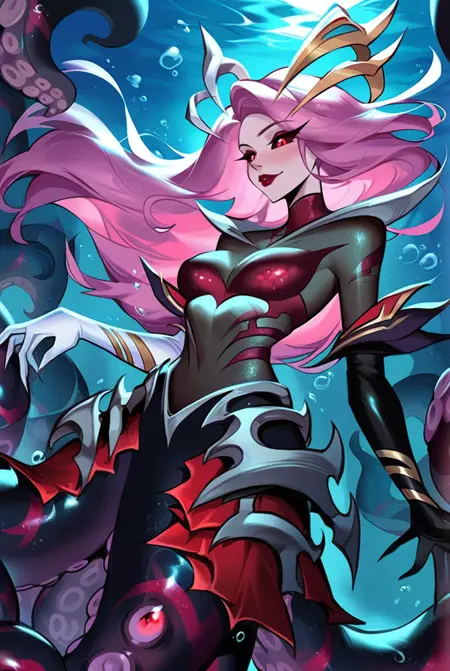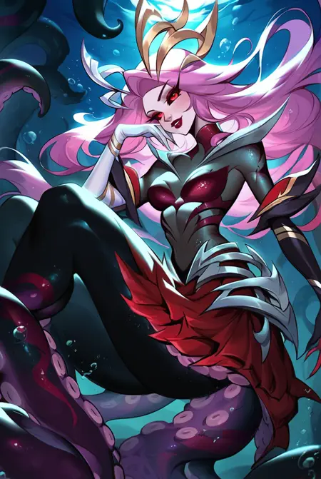 c0venn4mi, coven nami, 1girl, monster girl, red eyes, colored sclera, black sclera, (tentacles:1.2),(octopus girl, scylla), long hair, pink hair,