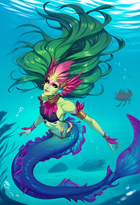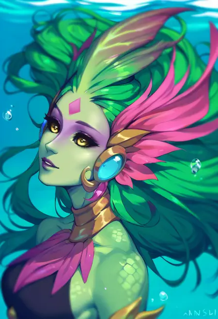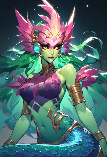 riv3rspiritn4mi, 1girl, monster girl, mermaid, green skin, colored skin, yellow eyes, long hair, green hair,