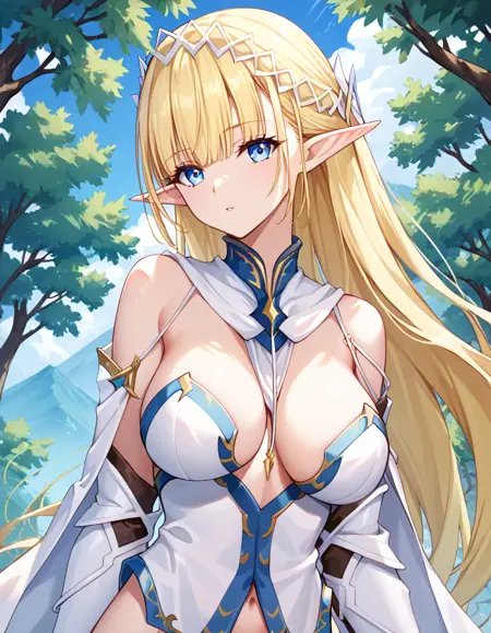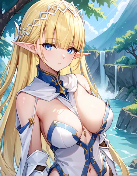 score_9,score_8_up,score_7_up,seras_ashrain,1girl,pointy ears,blonde hair,blue eyes,elf,long hair,bangs,breasts,large breasts.