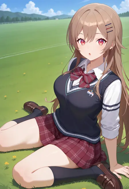 outfit2aafuren, 긴 머리, 갈색 머리, 머리 끝 클립, 빨간 눈, 가슴, 학교 정장, 줄무늬 넥타이, 빨간 넥타이, 카라 셔츠, 흰색 셔츠, 스웨터 베스트, 검정 베스트, 소매 걷어 올림, 체크 무늬 스커트, 빨간 스커트