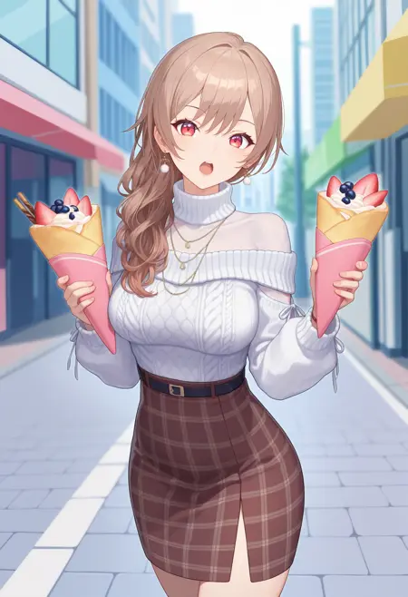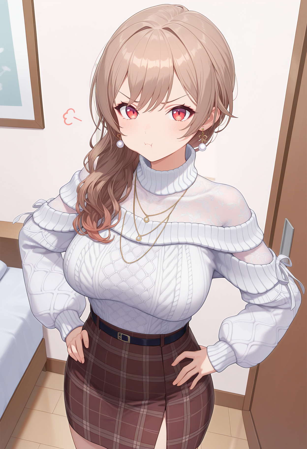 outfit4aafuren, 긴 머리, 갈색 머리, 귀걸이, 빨간 눈, 가슴, 어깨에 머리 넘겨짐, 카라 터틀넥, 목걸이, 어깨 노출, 흰색 스웨터, 긴 소매, 검정 벨트, 허리 높이 스커트, 체크 무늬 스커트, 갈색 스커트