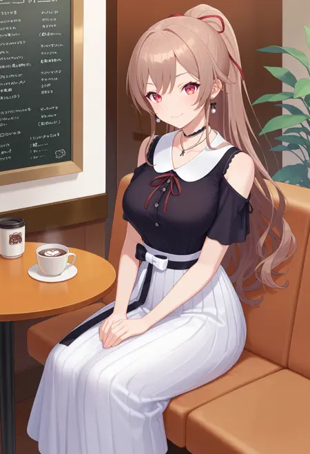 outfit3aafuren, 긴 머리, 갈색 머리, 붐테일, 머리 리본, 빨간 리본, 귀걸이, 빨간 눈, 가슴, 검정 콕셔, 목걸이, 목 리본, 어깨 삭감, 검정 셔츠, 짧은 소매, 톤온톤 바, 긴 스커트, 흰색 스커트