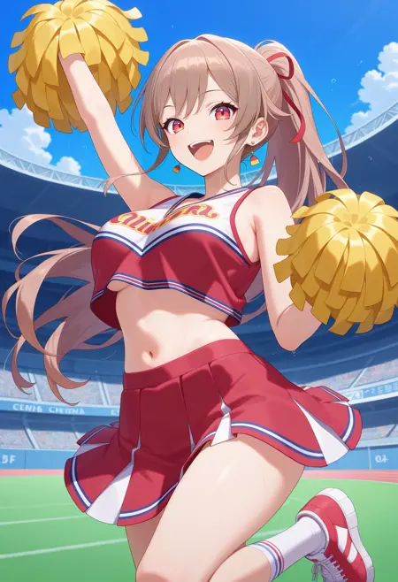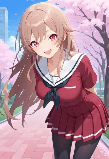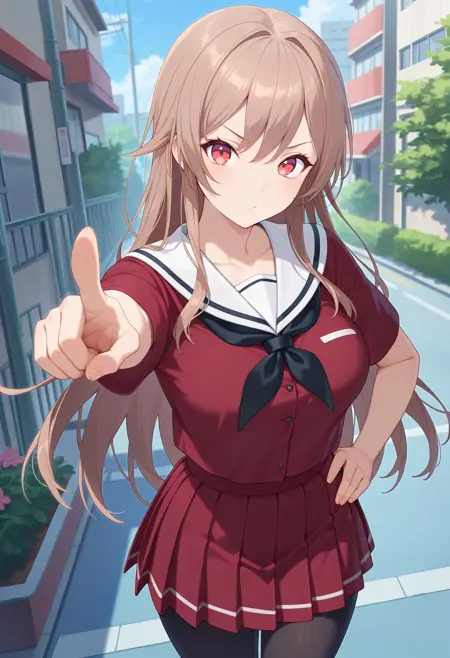 outfit6aafuren, 긴 머리, 갈색 머리, 빨간 눈, 가슴, 세라푸쿠, 흰색 선원 카라, 검정 네크리스, 빨간 셔츠, 짧은 소매, 빨간 스커트, 접힌 스커트, 검정 팬티히어