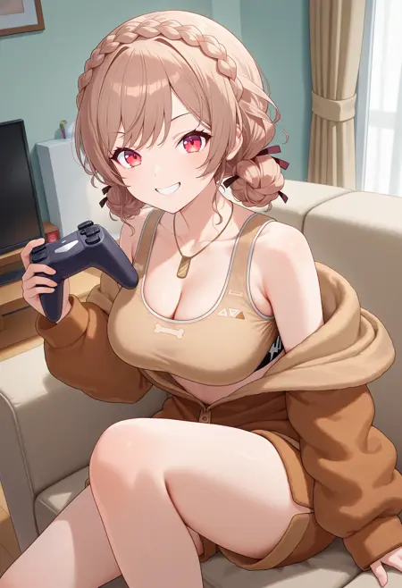 outfit5aafuren, 짧은 머리, 갈색 머리, 땋은 머리, 땋은 뒷머리, 두 개의 뒷머리단, 머리 리본, 빨간 눈, 가슴, 목걸이, 절개선, 스포츠 브라, 갈색 셔츠, 어깨 노출, 갈색 자켓, 긴 소매, 갈색 반바지