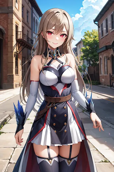 outfit1aafuren, long hair, brown hair, red eyes, breasts, detached collar, halterneck, bare shoulders, black dress, detached sleeves, white sleeves, bridal gauntlets, belt, white skirt, garter straps, black thighhighs