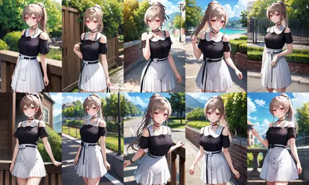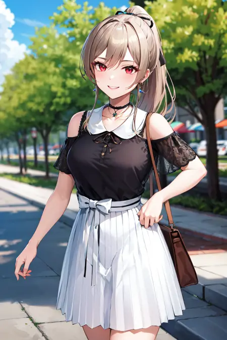 outfit3aafuren, long hair, brown hair, ponytail, hair ribbon, red ribbon, earrings, red eyes, breasts, black choker, necklace, neck ribbon, shoulder cutout, black shirt, short sleeves, two-tone bow, long skirt, white skirt