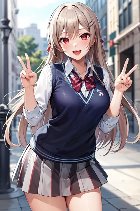 outfit2aafuren, long hair, brown hair, hairclip, red eyes, breasts, school uniform, striped bowtie, red bowtie, collared shirt, white shirt, sweater vest, black vest, sleeves rolled up, plaid skirt, red skirt