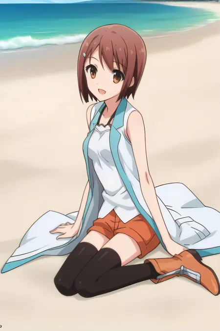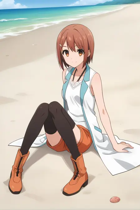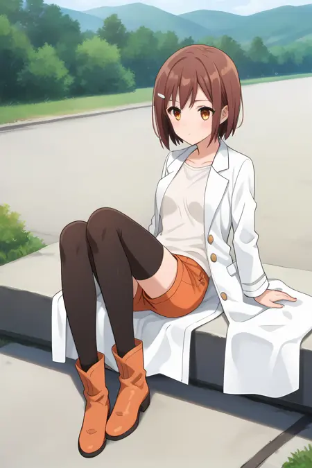 白いコート、白いシャツ、オレンジ色のショートパンツ、黒いシンソックス、茶色の膝上ブーツ
