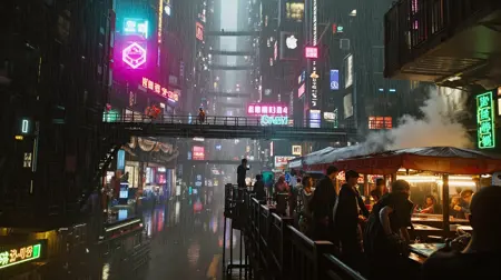 「映画的、中距離ショット。男性と女性が狭く薄暗い路地に立っている。ネオンサインの柔らかな赤と緑の光が、濡れたアスファルトに長い影を落とし、細かな雨が降っている。1960年代の香港を舞台に、低角度から撮影。ソフトなグリーンと深みのあるレッドのカラーパレット。Arri Alexa と Kodak Portra 400 フィルムで撮影。監督:Wong Kar-wai。このシーンは、深い郷愁と静かなロマンスに満ちている。」