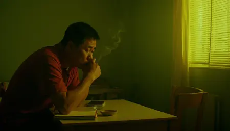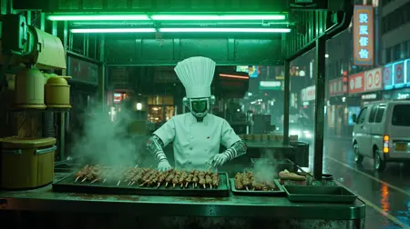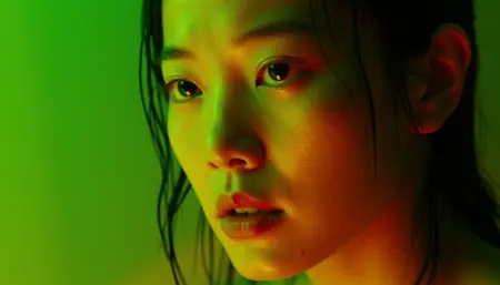 “영화적, 중거리 촬영으로 남자와 여자가 좁고 어두운 골목에 서 있는 장면. 빨간색과 녹색 네온사인의 부드러운 빛이 젖은 인도 위에 긴 그림자를 드리운다. 가볍게 떨어지는 비, 1960년대 홍콩을 배경으로, 저각 촬영. 부드러운 녹색 + 진한 빨강 색상 팔레트. Arri Alexa 카메라와 Kodak Portra 400 필름으로 촬영. 홍자개 감독. 장면은 깊은 향수와 조용한 로맨스로 가득 차 있다.”