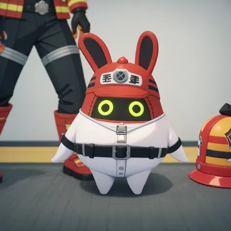 例のプロンプト:very aesthetic, newest, best quality, masterpiece, absurdres, bangboo \(zenless zone zero\), firefighter, white background