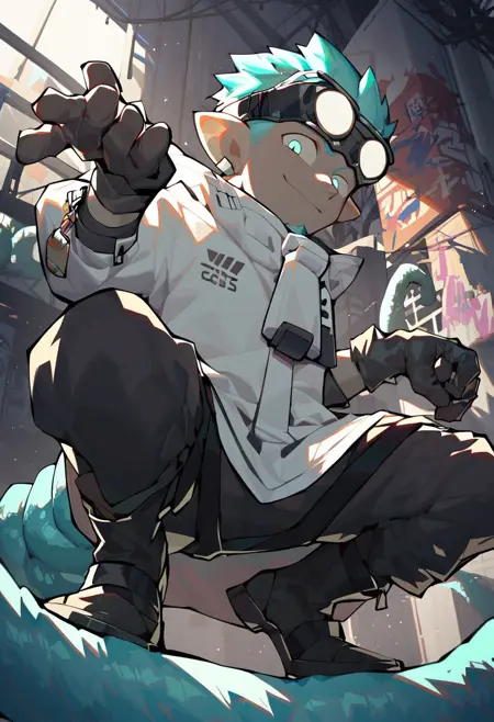 水色头发、白色眼睛、尖耳朵、胡须、山羊胡、深色皮肤男性、蜥蜴尾巴、创可贴、蓝色舌头