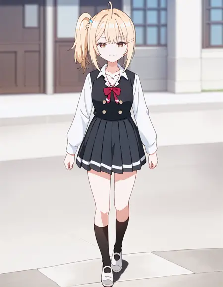 school uniform, collarbone, necklace, white shirt, long sleeves, red bow, black vest, buttons, pleated skirt, black socks, white footwear