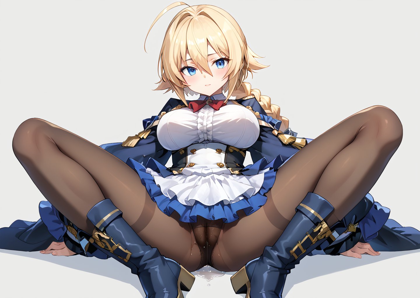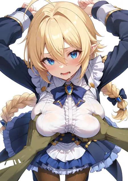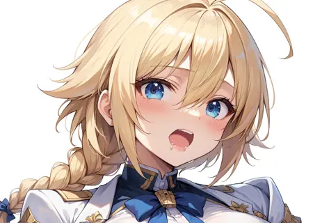 ES,large breasts,blue eyes,blonde hair,hair between eyes,ahoge,single braid,long hair,