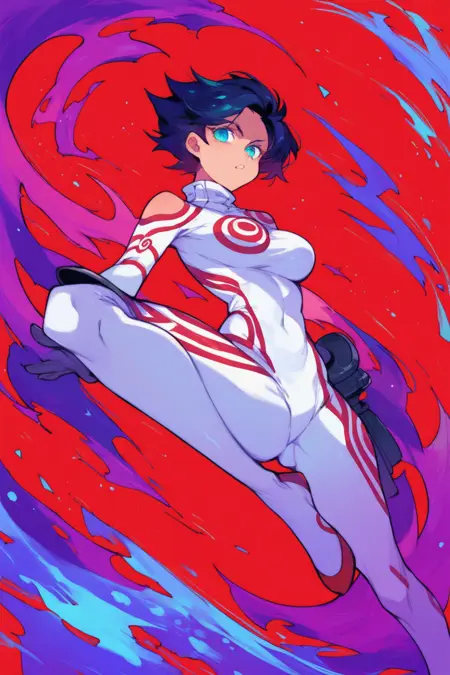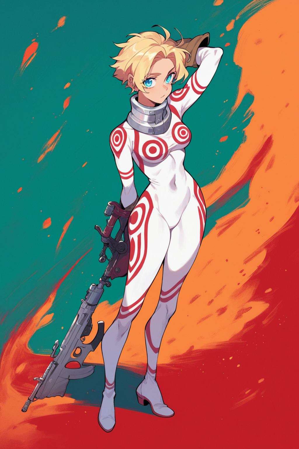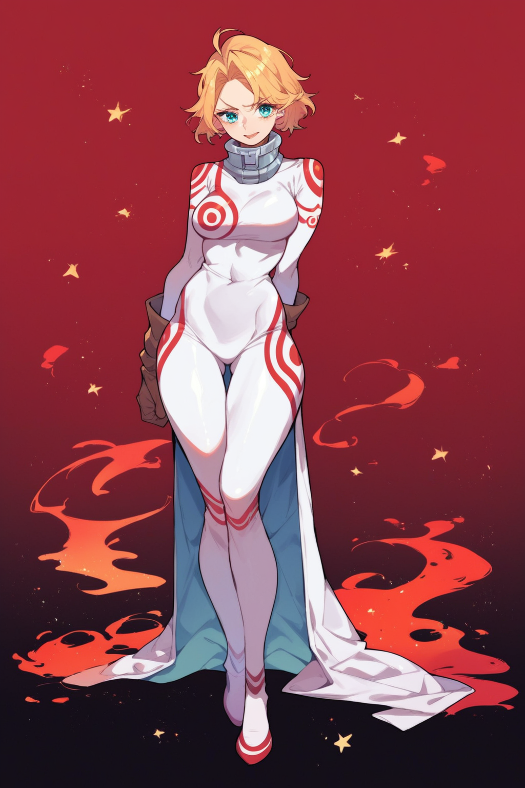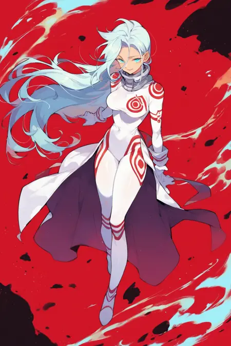 프롬프트: shiro_outfit, white_jumpsuit, red_markings, white bodysuit, skin tight