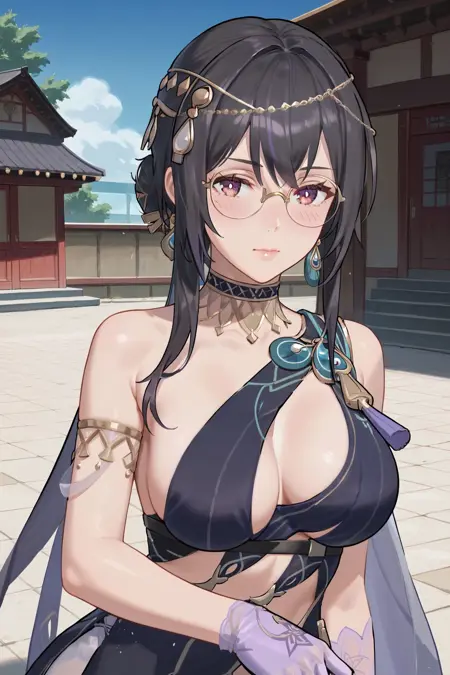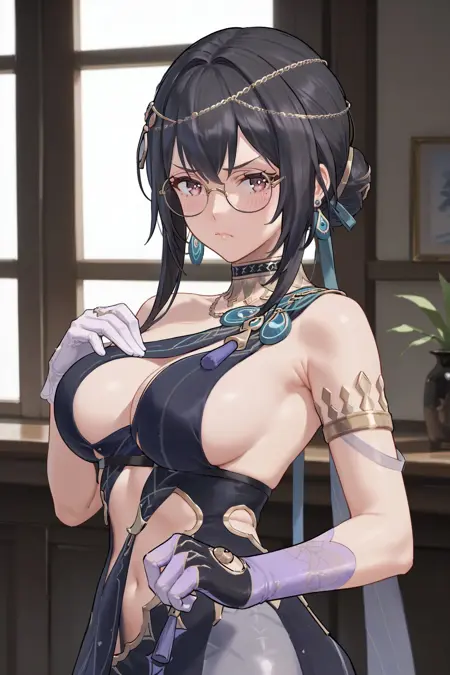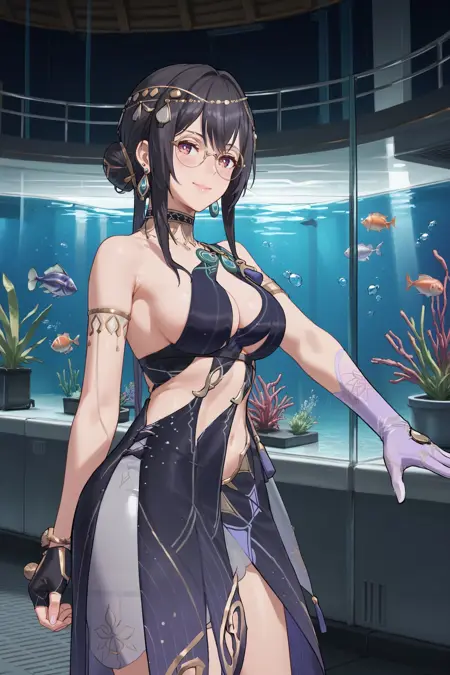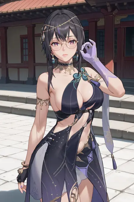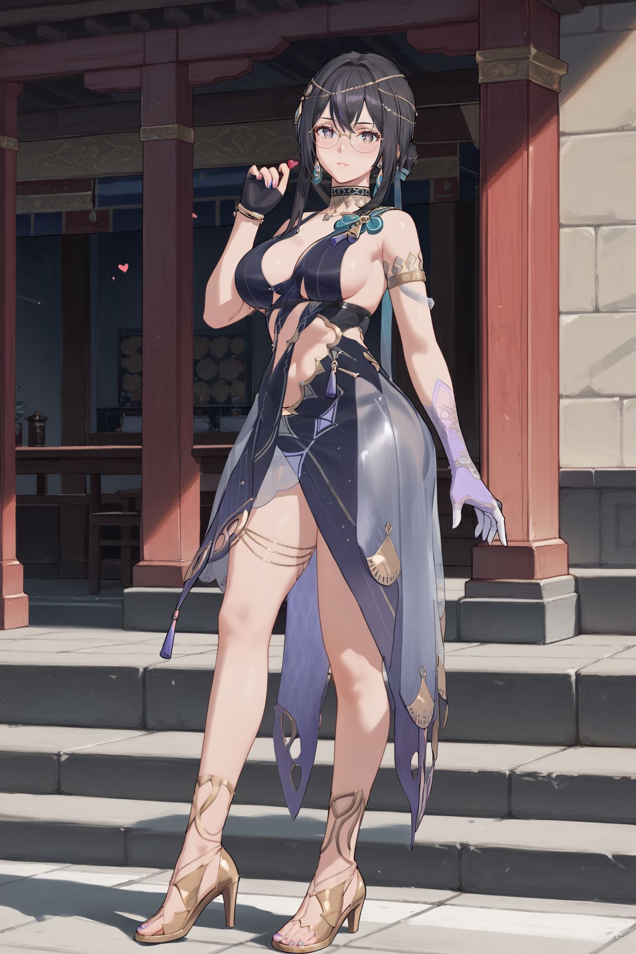 dress, gloves, armlet, glasses, earrings, see-through, jewelry, high heels, mole under eye