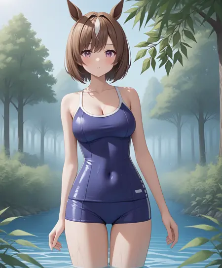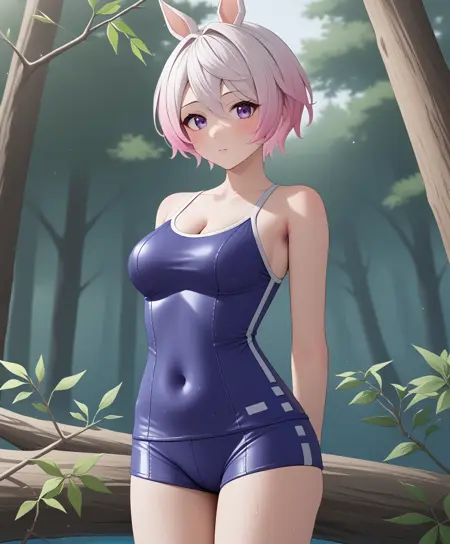 - cleavage, bare shoulders, collarbone, hotpants, shorts, swimsuit, covered navel, taut clothes, romper suit, tracen swimsuit
