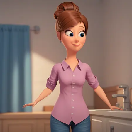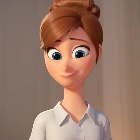 JaniceTemplerton, 1girl, solo, brown hair, single hair bun, blue eyes,