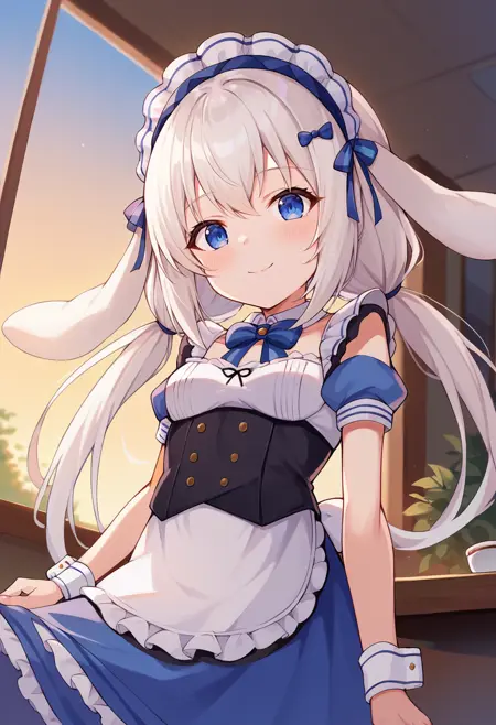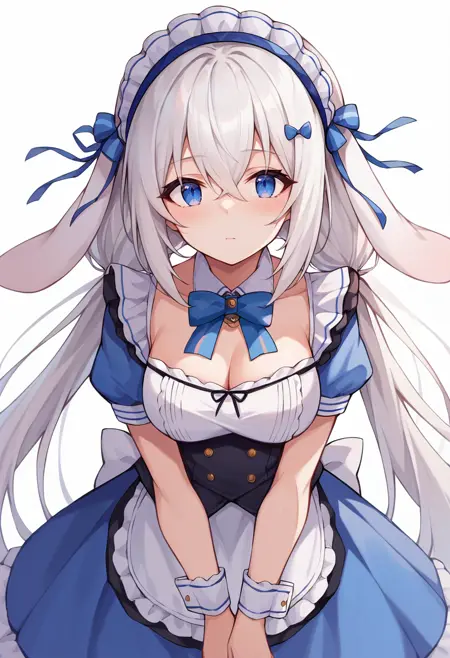 外貌:蓝色眼睛,动物耳朵,兔耳,长发,头发遮住眼睛,白发,双马尾