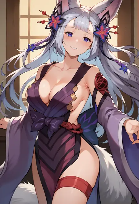 - gbfsocie, 여우 귀, erune, 여우 꼬리, 긴 머리, scssrpurple, 중앙 플랩 앞머리, 머리 장식, 머리핀, 머리 꽃, 보라색 드레스, 빨간 어깨 보호대, 클러비컬, 가슴 사이, 사이드북, 사이드리스 옷, 분리된 소매, 넓은 소매, 빨간 허벅지 스트랩, 발목 장식,