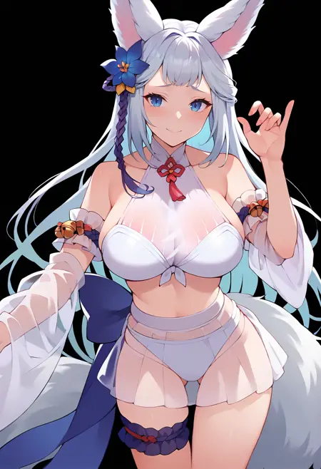 gbfsocie, 여우 귀, erune, 여우 꼬리, 긴 머리, scswimsuit, 머리 장식, 머리 꽃, 파란 꽃, 크롭 탑, 흰색 비키니, 투명, 분리된 소매, 진동 종, 팔 팔찌, 흰치마, 검은 허벅지 스트랩,