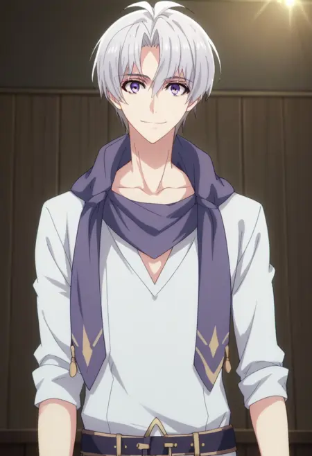 sogosaka, 1boy, male focus, boots, bracelet, jewelry, purple eyes, grey hair, scarf, belt, idol uniform,