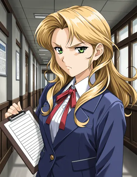 - kaori, green eyes, blonde hair, blue jacket, neck ribbon, red ribbon, blue skirt