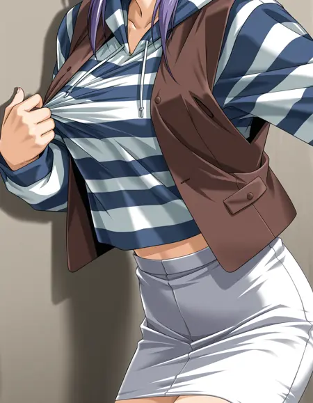- t4k4b3, red eyes, hair ribbon, striped hoodie, pencil skirt, white skirt