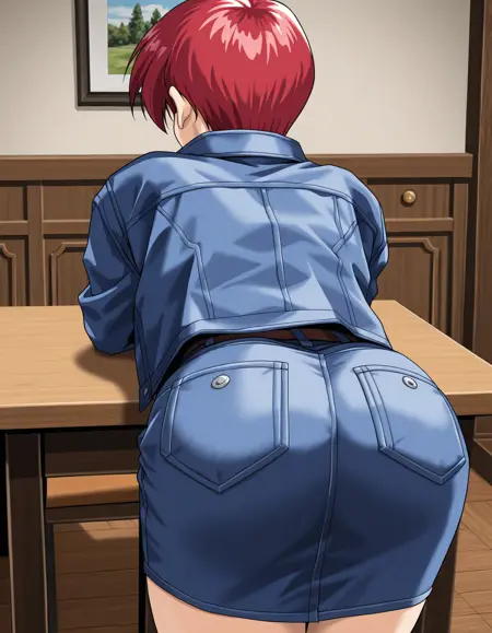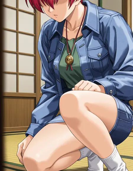 - asami, short hair, red hair, blue eyes, locket, denim jacket, open jacket, green shirt, denim skirt