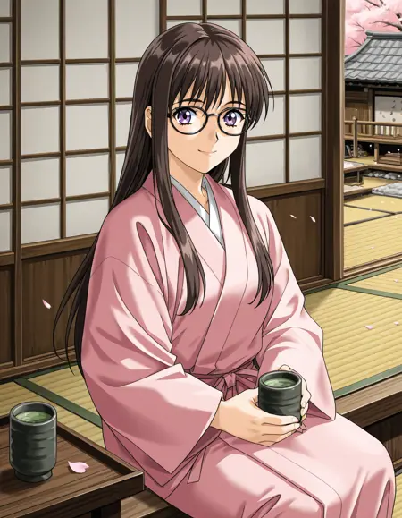 - shiho, brown hair, purple eyes, glasses, sidelocks, long hair, robe, pink robe
