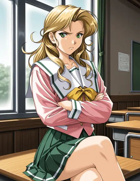 - kaori, green eyes, blonde hair, serafuku, pink shirt, pleated skirt, green skirt