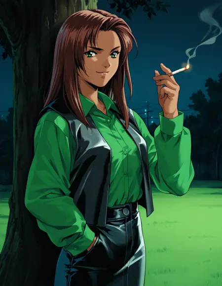 - moeko, dark-skinned female, leather vest, green shirt, navel, leather skirt