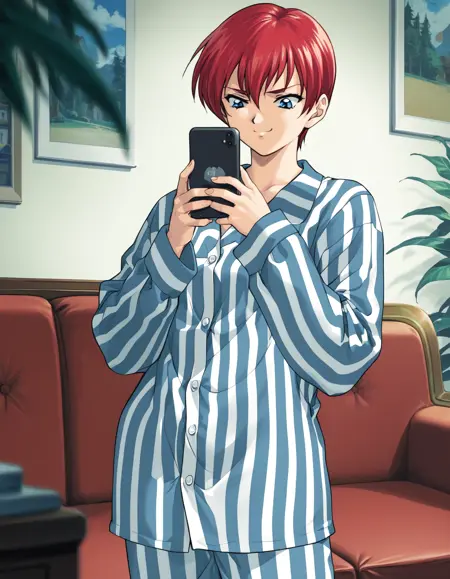 - asami, short hair, red hair, blue eyes, striped pajamas, vertical stripes