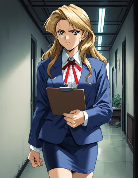 - kaori, green eyes, blonde hair, blue jacket, neck ribbon, red ribbon, blue skirt