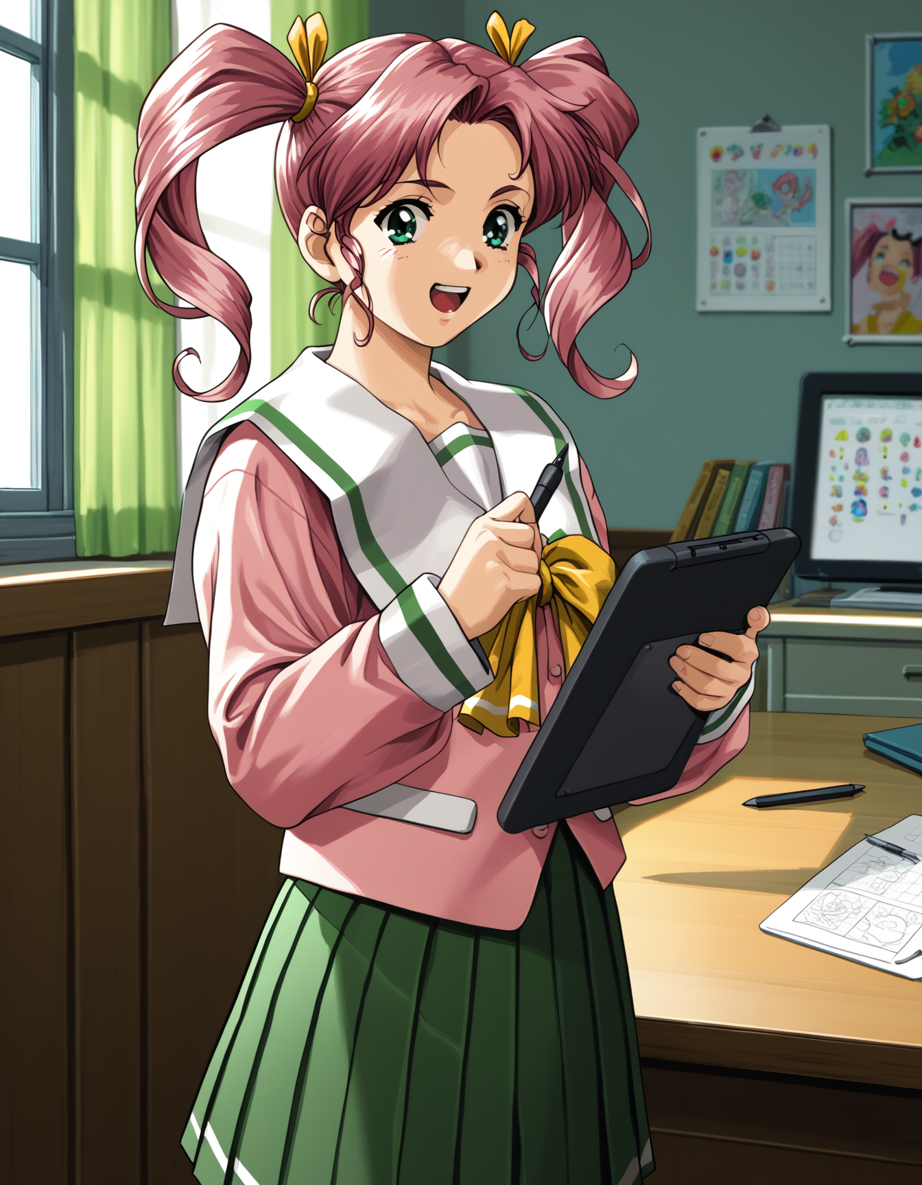 - chiaki, twintails, serafuku, pink shirt, pleated skirt, green skirt