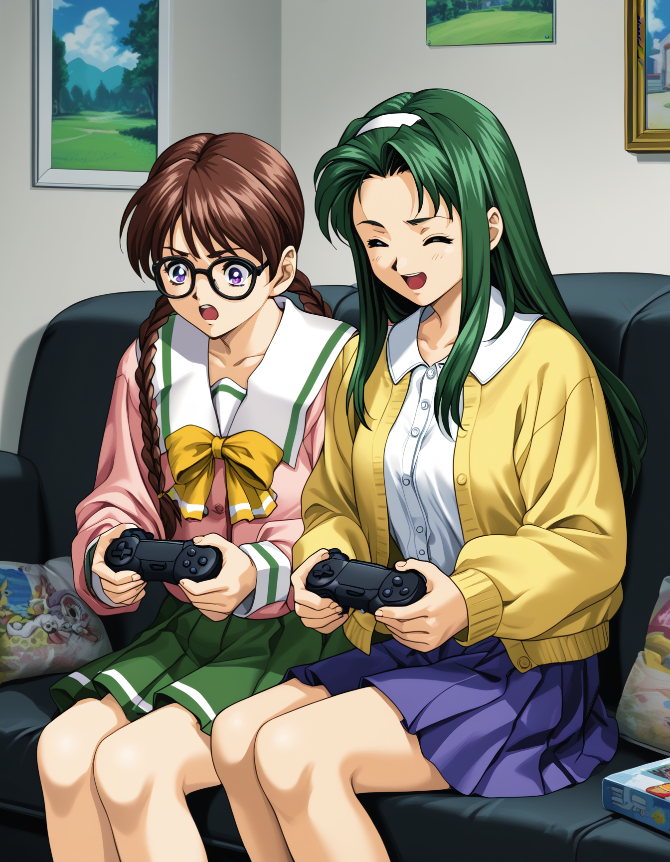 - n4g1s4, green hair, red eyes, hairband, cardigan, yellow cardigan, white shirt, purple ribbon, purple skirt, microskirt