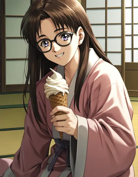 - shiho, brown hair, purple eyes, glasses, sidelocks, long hair, robe, pink robe
