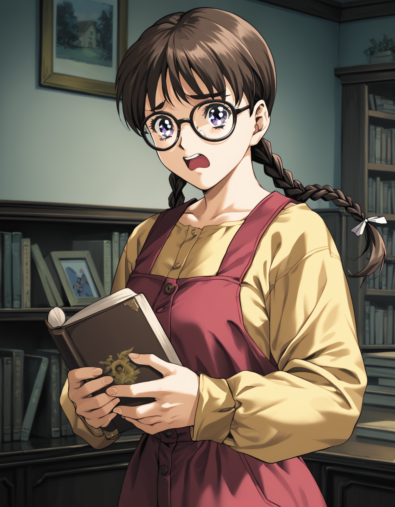 - sh1h0, brown hair, purple eyes, glasses, twin braids, pinafore dress, red dress, yellow shirt, long sleeves